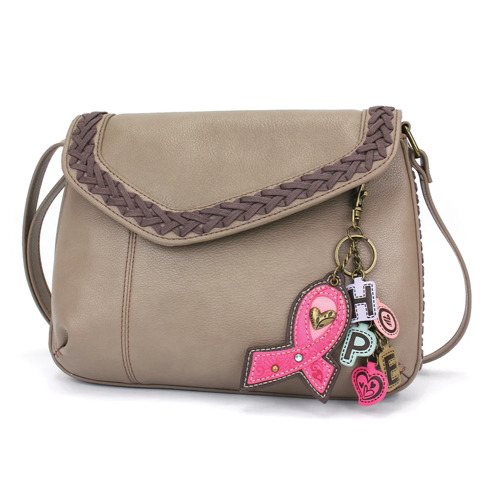 Braided Boho Crossbody – Charming Charms Pink Ribbon – warm gray