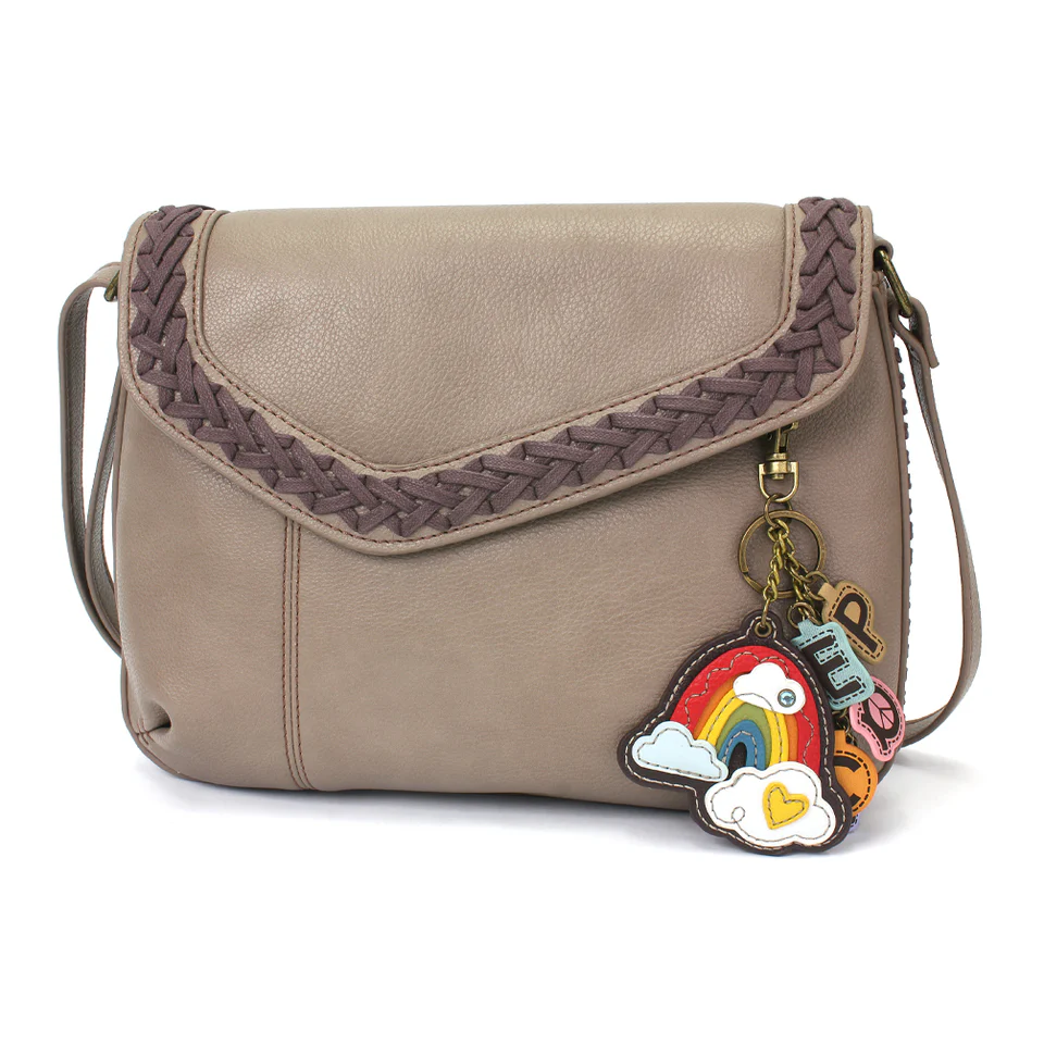 Braided Boho Crossbody – Charming Charms Rainbow+PEACE – warm gray
