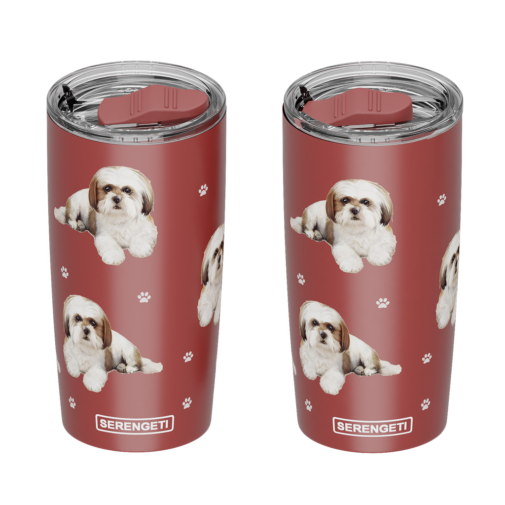 Affectionate, charming, and full of fluff—just like your Shih Tzu. This Shih Tzu Serengeti Tumbler by E&S Pets features a detailed, full-color illustration of this lovable little companion. Made from durable stainless steel with double-wall insulation, it keeps your drinks hot or cold while showing off your love for this royal lapdog.